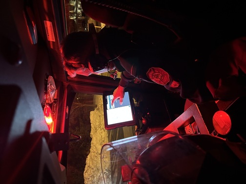 Firefighter accessing information in real-time using upgraded technology in an MFES truck.