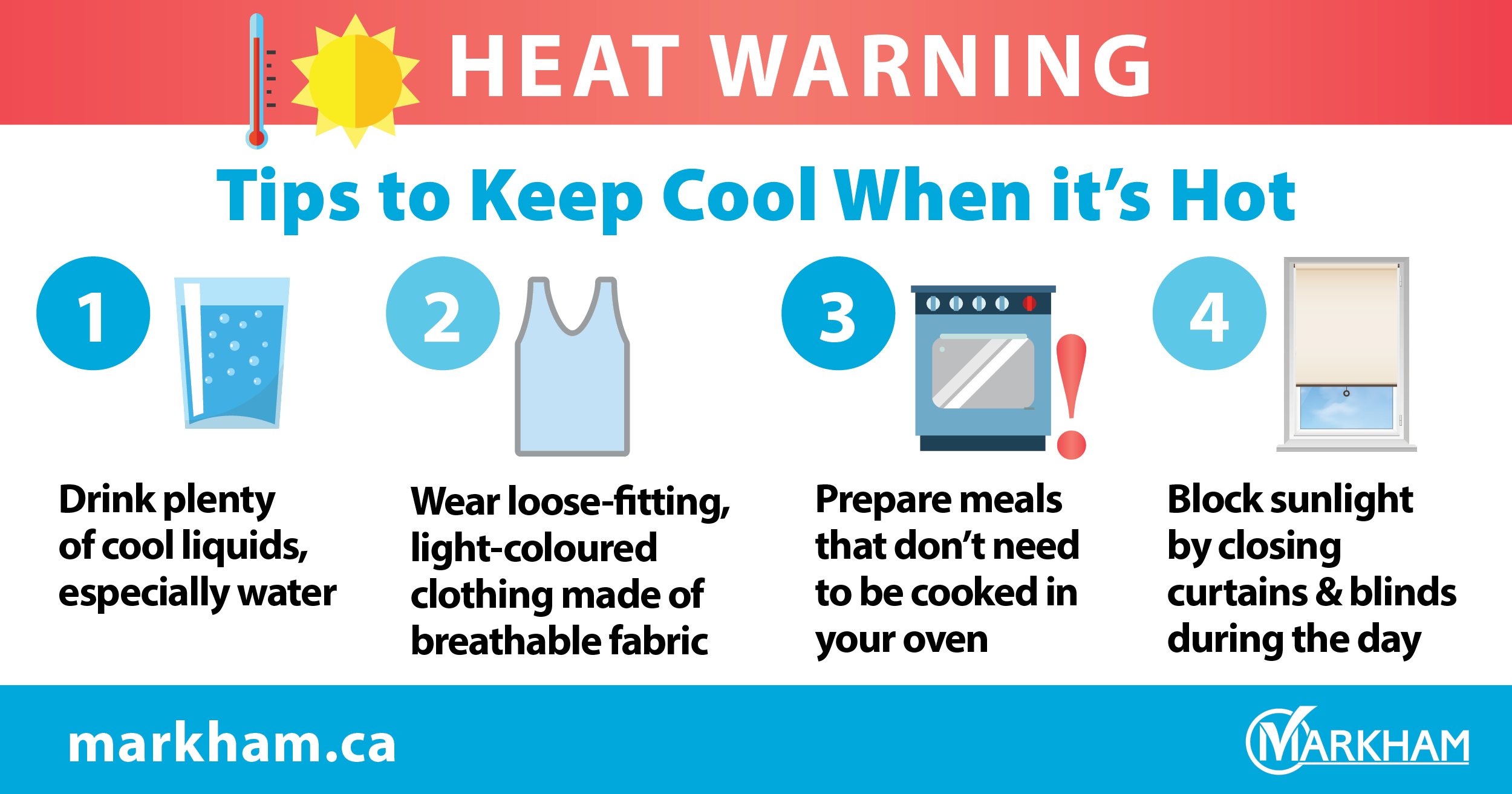 It is important to take precautions to avoid suffering heat-related illnesses. Markham recommends the following based on Health Canada guidelines: